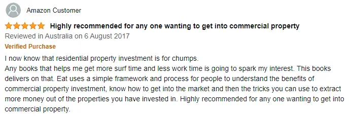 “Melissa’s book changed my perspective on investment strategy completely. We had previously been consulting with a well-known specialist in the residential sector and her book opened my eyes to the world of commercial and industrial cash flow positive property options. Her knowledge and credibility, not to mention success, across the property industry has led to ongoing support and ambition for me to create successful investment outcomes for my family”